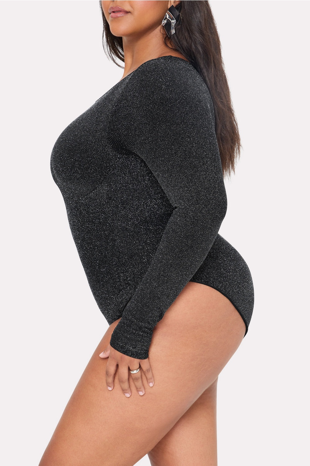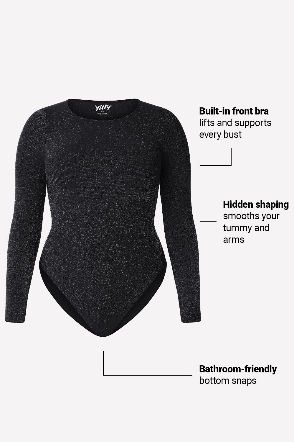 Revolutionary shapewear meets limited-edition sparkle. Our Long Sleeve Bodysuit features all-around contouring compression to smooth the tummy, back, and arms. A hidden front bra defines and supports all busts. Runs small. Size up for your best fit.