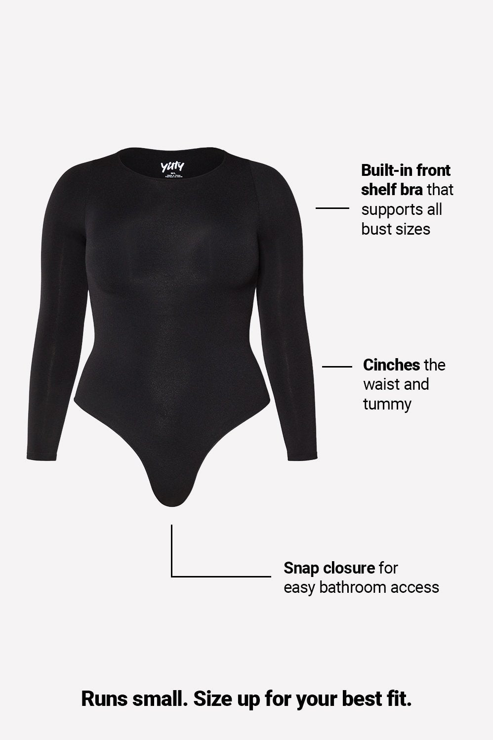 Our Long Sleeve Bodysuit features hidden targeted zoning technology to cinch your waist and support and define your bust, plus all-around smoothing compression, seamless 4-way stretch fabric, and a brief bottom. Runs small. Size up for your best fit.