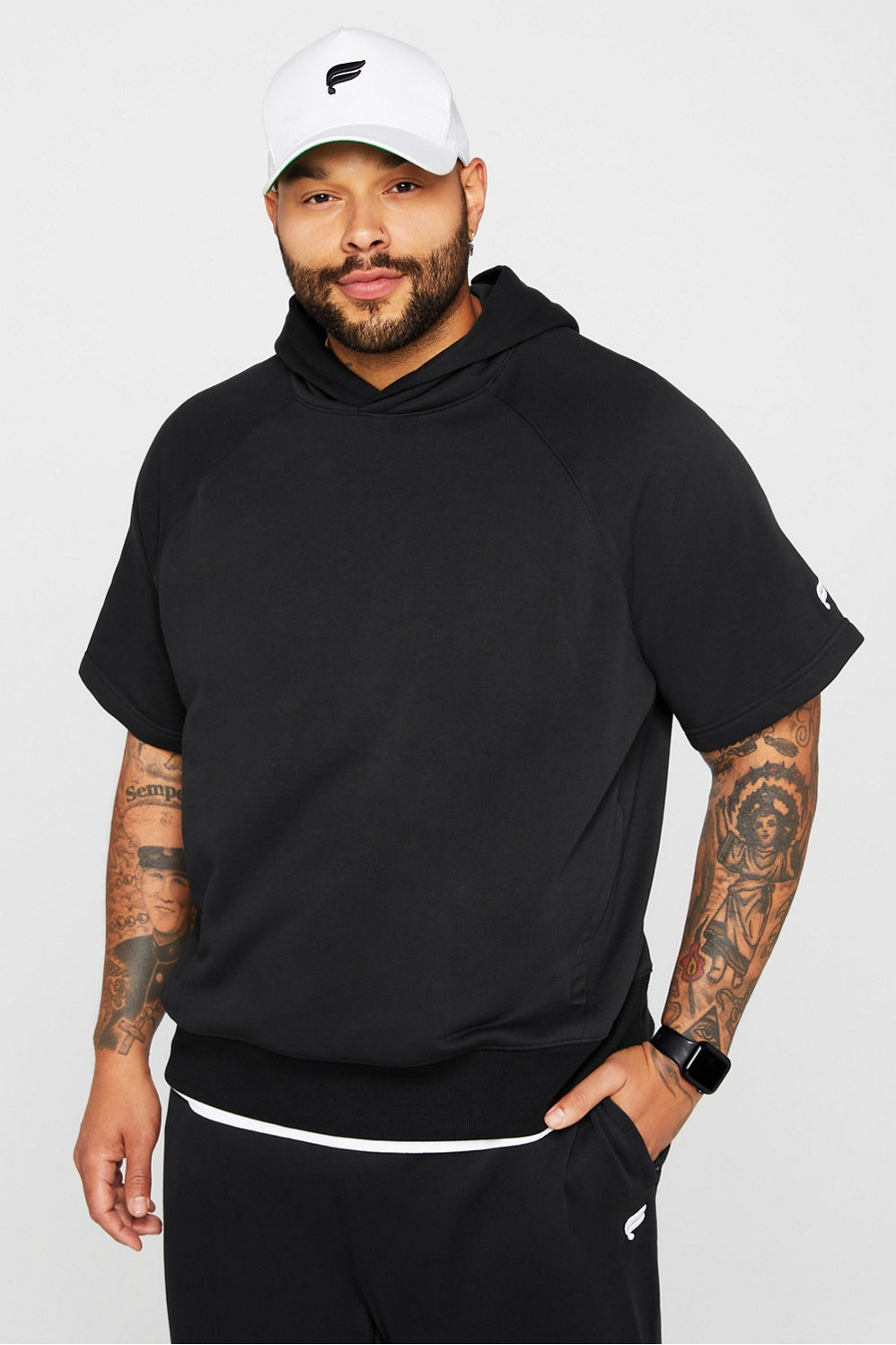 Sporty edge meets major comfort. With short sleeves, a hooded neckline, zip pockets, and soft terry fleece, this is the perfect overlayer to keep you at ease and on-trend on your most casual days.